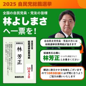 「実こそあれば今月今宵、一夜明ければみんな来る」—これは、わが長州の維新の偉人・高杉晋作が、まさに決起の時の残した言葉です。総裁選という挑戦にあたり、この気持ちを胸に、国民の皆様一人ひとりのご理解と共感を少しでも多く得られるよう、政策を力強く訴えてまいります。そして、「夜明け前が一番暗い」。私の好きな言葉です。日本を取り巻く現状は決して明るくありません。しかし、世界の人々は「治安が良く、優しく、すばらしい国」と日本を高く評価しています。政策をしっかり繋ぎ合わせ、的確な運営ができれば、日本はまだまだ豊かに成長できる—この確信を持ち、国の未来の舵取りに全力で取り組む覚悟です。今、この暗い時期を皆さまと共に乗り越え、希望ある明日へ歩みを進めていきたい。どうか林芳正に一票を、皆様の想いを託してください。